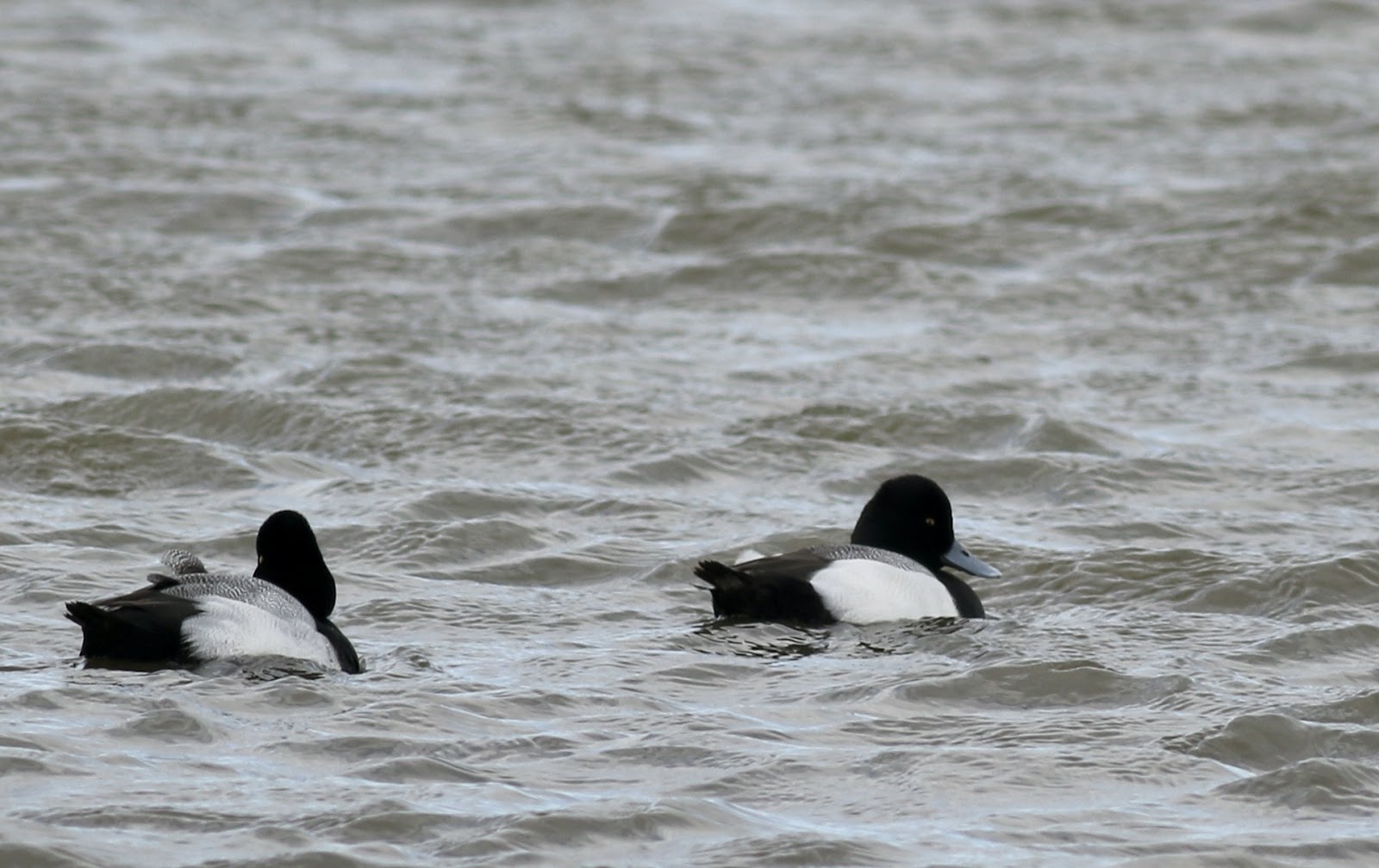 Most of the Scaup were difficult to ID but with some study I was able to pick out one of each. The "cleaner" one on the right is a Greater Scaup. Note the more rounded head and whiter flank.