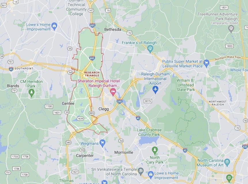 Technically Research Triangle Park (RTP) is just a smaller area where all the research facilities are nested between the cities of Raleigh, Durham and Chapel Hill, hence the name the "triangle". However, over the years I have noticed when someone says they live in the Triangle or RTP, what they mean is they live in a town that is centered near RTP. I would consider both Apex and Cary to be in this boundary but its definitely not an official boundary and people that live in those towns may not agree. Here is the generally accepted boundary of what is RTP which is decidedly north and west of Apex and Cary:
