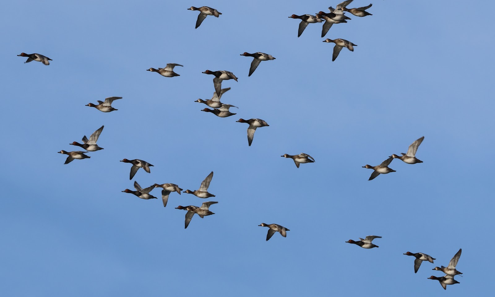 Redheads flushed from the sound west of the north pond flew up into a giant flock that streamed over to reposition to south pond.