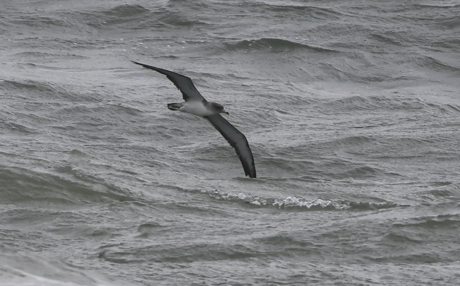 To me, it looks as if the white extends into the "hands" of the wingtips but it is admittedly hard to gauge because this bird's primary feathers are in molt. I posted some of these pics on a Facebook pelagic bird group and the first two people that weighed in said it looked good for a Scopoli's Shearwater which would be New Hanover's first record. However, just today someone else weighed in and challenged that ID.